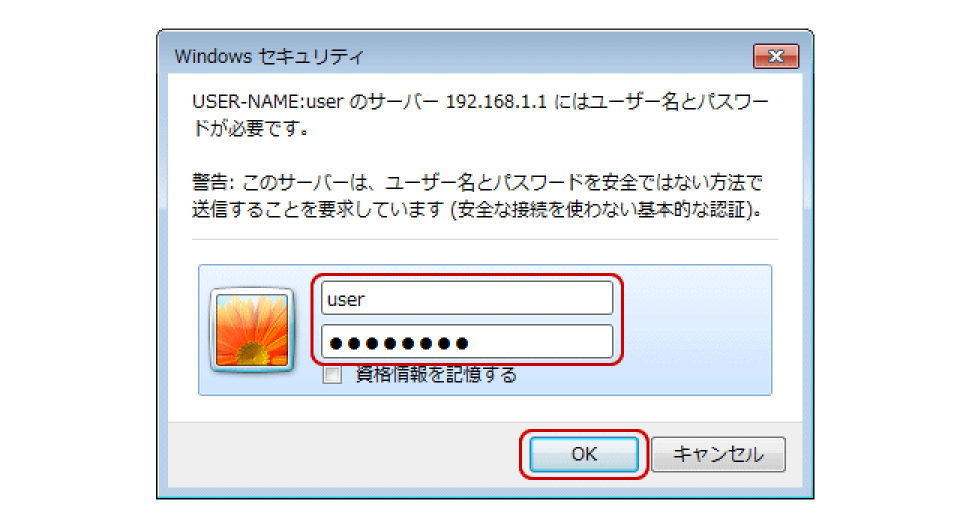 [Windows セキュリティ]画面が表示されます。上段にuser、下段に最初にご自身で決めたパスワードを入力し、[OK]をクリックします。