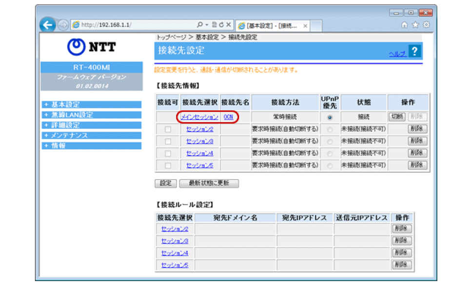 [メインセッション]をクリックします。(機器によっては[メインセッション]ではなく接続先名のみ表示されています。その場合接続先名をクリックして下さい。)