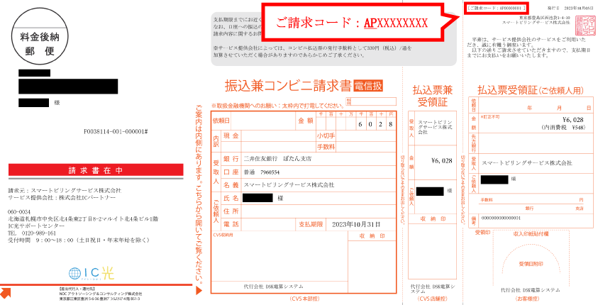 2023年10月13日~16日に発送を行った2023年7月利用分もしくは2023年8月利用分の振込兼コンビニ請求書(請求元:スマートビリングサービス株式会社)